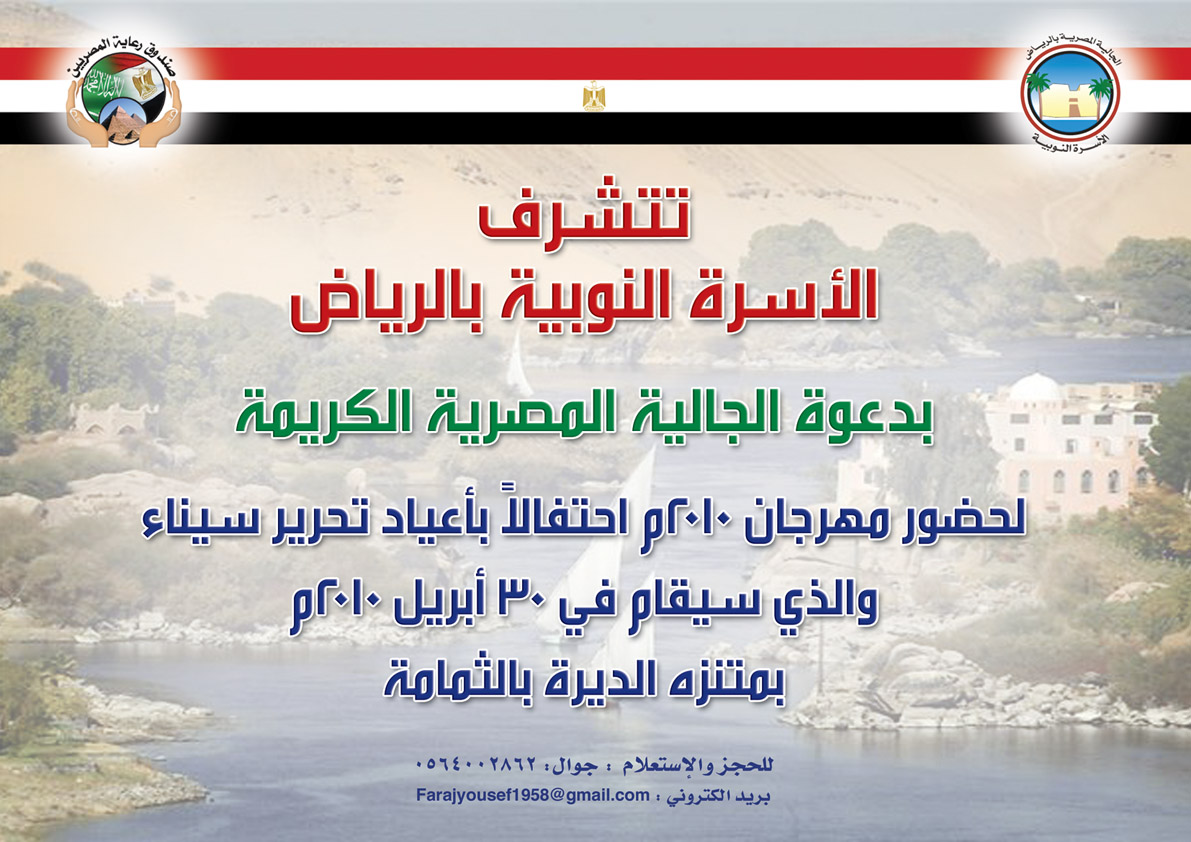 تكليف الأسرة النوبية بتنظيم مهرجان الجالية المصرية لهذا العام ... تباع تذاكر المهرجان لدى ** جمعيات الجالية المصرية ** مقر صندوق رعاية المصريين بالقنصلية والمربع ** شركة رحاب مصر